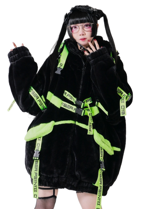 PSYNXX Cyberpunk Tech Faux Fur Black Green Oversized Jacket