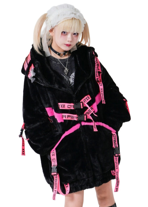 PSYNXX Cyberpunk Tech Faux Fur Black Pink Oversized Jacket