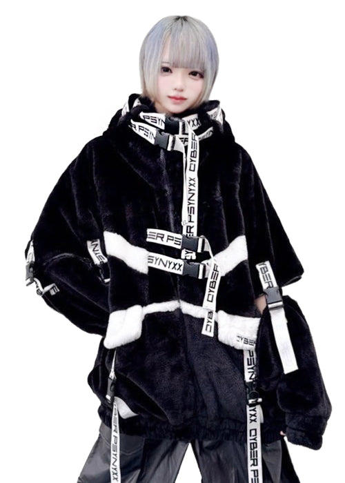 PSYNXX Cyberpunk Tech Faux Fur Black White Oversized Jacket