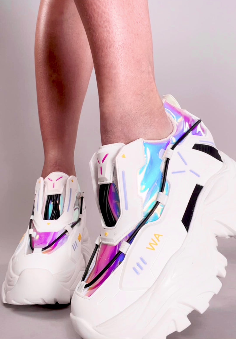 Give yourself the ultimate upgrade wit the Anthony Wang X LASR Exclusive Cybernetic Platform Sneakers. These top shelf tech rave platform sneakers feature a white vegan leather upper with iridescent contrasting detail, PU cable and embossing accents, an easy slip-on style, chunky tread bottoms, and cushioned hidden interior heel. With these cute sneakers you’ll give all the net runners a run for their money!